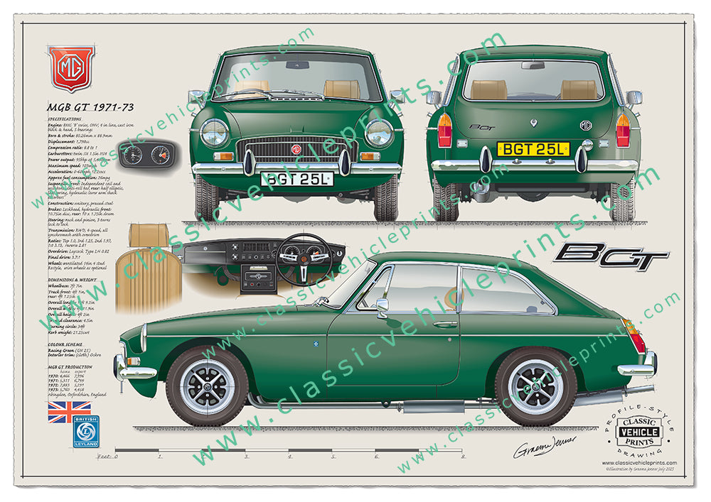 This illustration shows a 1971-73 chrome-bumper MGB GT with 14" Rostyle wheels.
