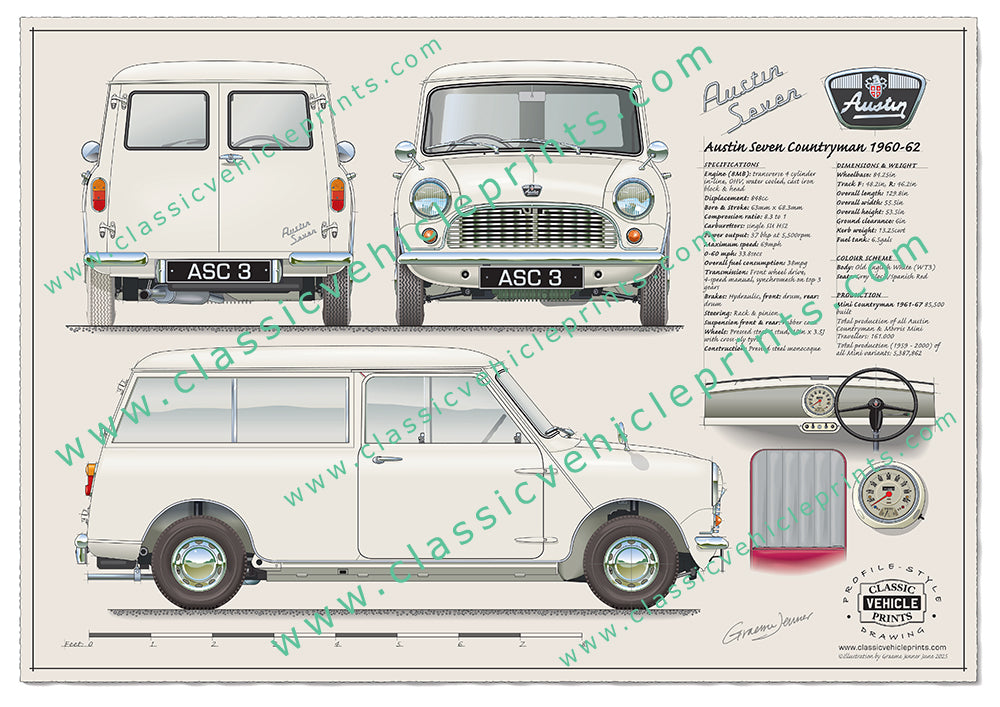 Originally badged as the Austin Seven Countryman, our illustration shows the original model sold between 1960 to 1962 featuring an 848cc engine giving a top speed of just 69mph with the 0-60 “sprint” taking a glacial 33.8 seconds!