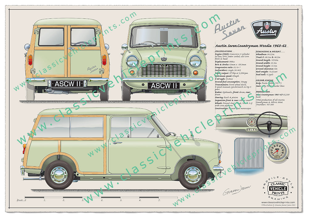 Originally badged as the Austin Seven Countryman, our illustration shows the original model sold between 1960 - 1962, featuring an 848cc engine giving a top speed of just 69mph with the 0-60 “sprint” taking a glacial 33.8 seconds!