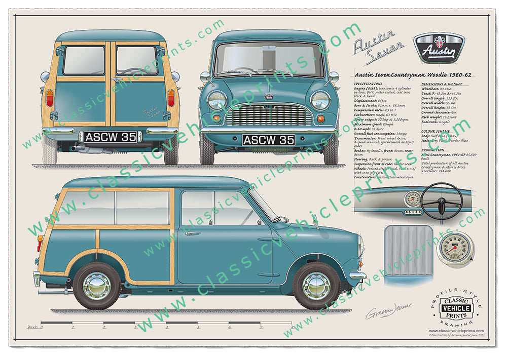 Originally badged as the Austin Seven Countryman, our illustration shows the original model sold between 1960 - 1962, featuring an 848cc engine giving a top speed of just 69mph with the 0-60 “sprint” taking a glacial 33.8 seconds!