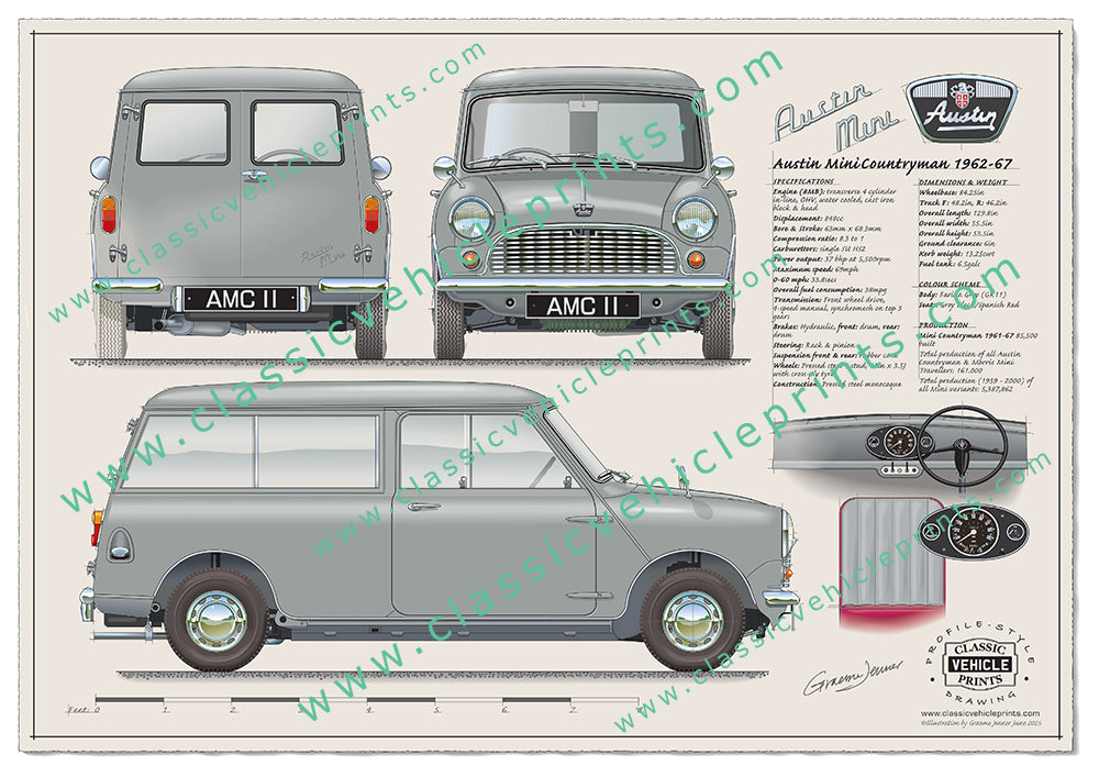 Originally badged as the Austin Seven Countryman, the Seven was dropped in 1962 with the car becoming simply the Austin Mini Countryman. Our illustration shows the model that was sold between 1962 to 1967 and although the badging was changed, the actual changes were few mainly focussing on interior refinements.
