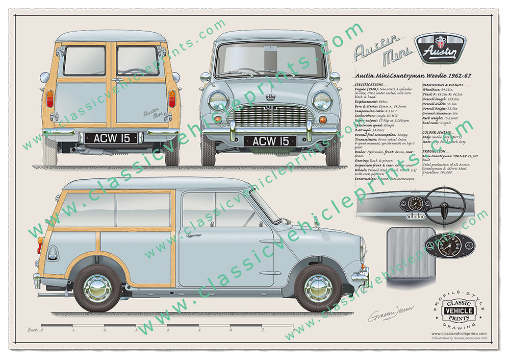 Originally badged as the Austin Seven Countryman, the Seven was dropped in 1962 with the car becoming simply the Austin Mini Countryman. Our illustration shows the model that was sold between 1962 to 1967 and although the badging was changed, the actual changes were few, mainly focusing on interior refinements. Whilst the standard model was finished in plain steel, the “Woodie” was also available. The “woodie” was, as the name suggests, finished with wood detailing similar to the classic Morris Minor Traveller.