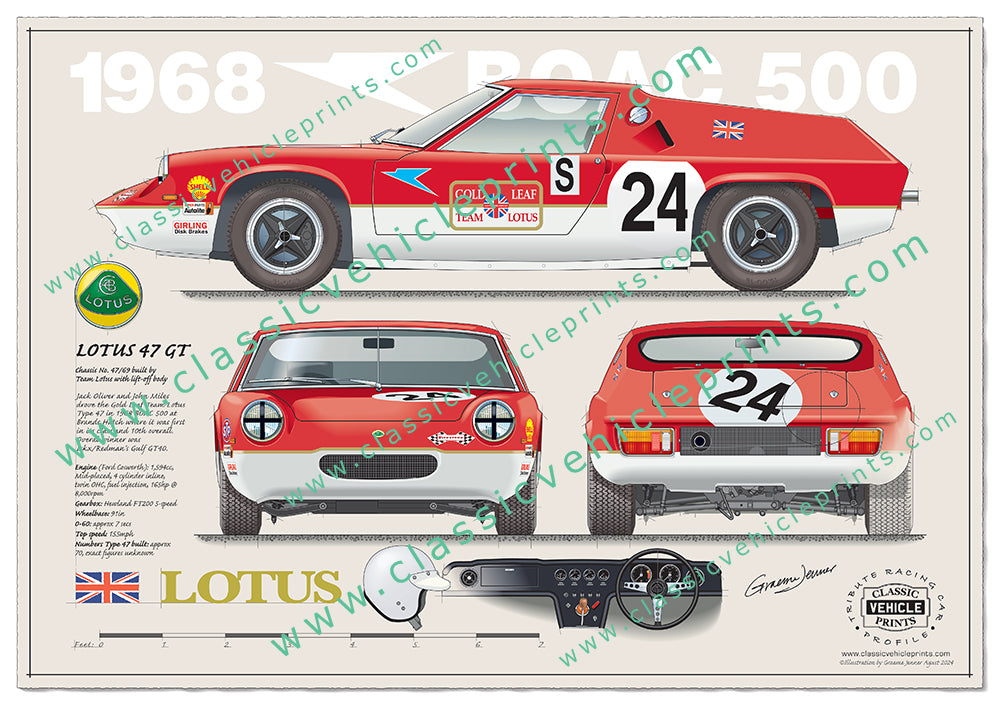 This drawing shows a version that won its class in the 1968 BOAC 500 race held at Brands Hatch. The drawing includes a helmet design in keeping with the period.
