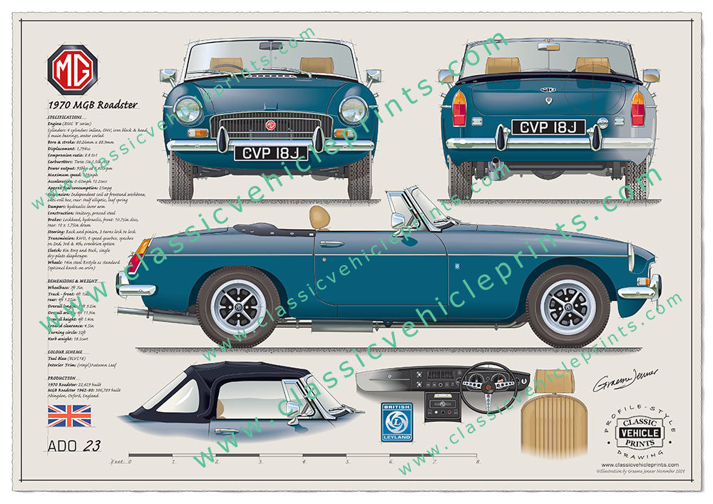 This illustration shows a chrome-bumper roadster from 1970 with 14" Rostyle wheels.