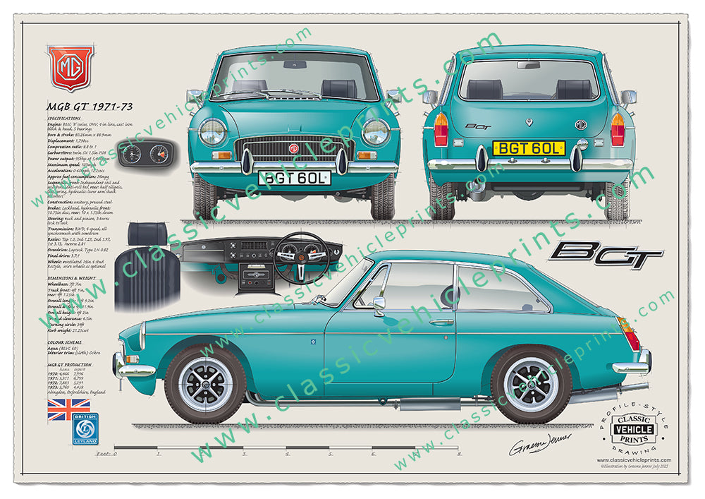 This illustration shows a 1971-73 chrome-bumper MGB GT with 14" Rostyle wheels.