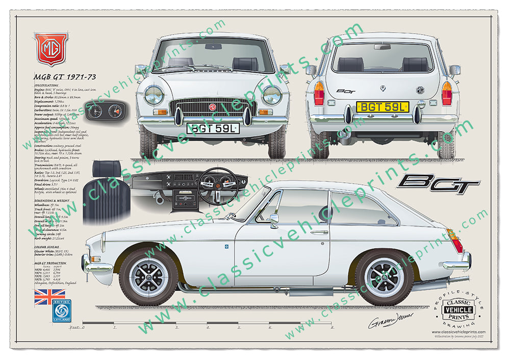 This illustration shows a 1971-73 chrome-bumper MGB GT with 14" Rostyle wheels.