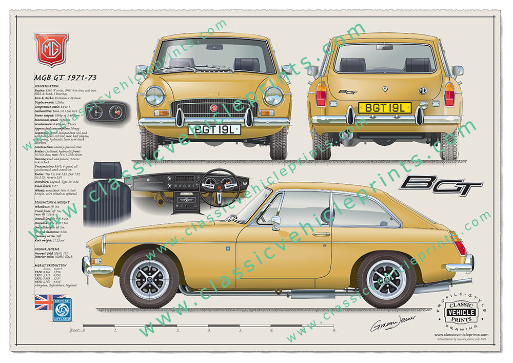 This illustration shows a 1971-73 chrome-bumper MGB GT with 14" Rostyle wheels.