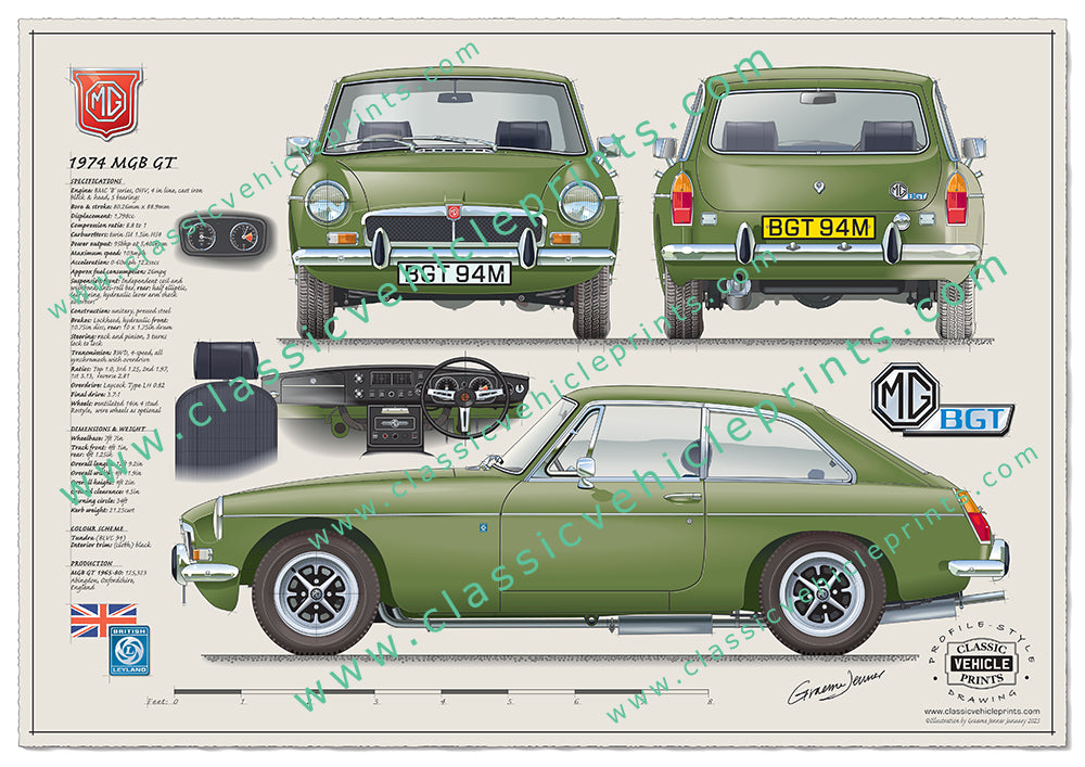This illustration shows a 1974 chrome-bumper MGB GT with 14" Rostyle wheels.
