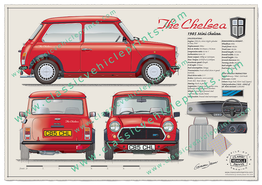 This illustration shows the 1985 Special Edition Mini Chelsea. The car featured a 998cc engine, extended wheel arches, and stylish upholstery. In all, 1,500 units were built.