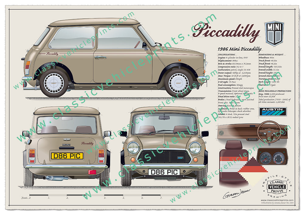 This illustration shows the 1986 Limited Edition Mini “Piccadilly”. The car featured a 998cc engine, extended wheel arches and distinctive badging. In total, 2,500 cars were produced.