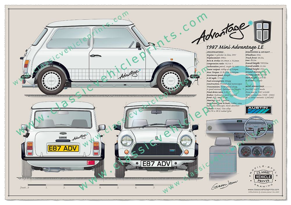 This illustration shows the 1987 Mini Advantage LE, which was launched in France in May 1987 for the French Open tennis championship. Diamond White paintwork, grey trim and the green and grey 'Tennis Net' interior. In total, 4,677 were produced, costing new in 1987 £4,286.