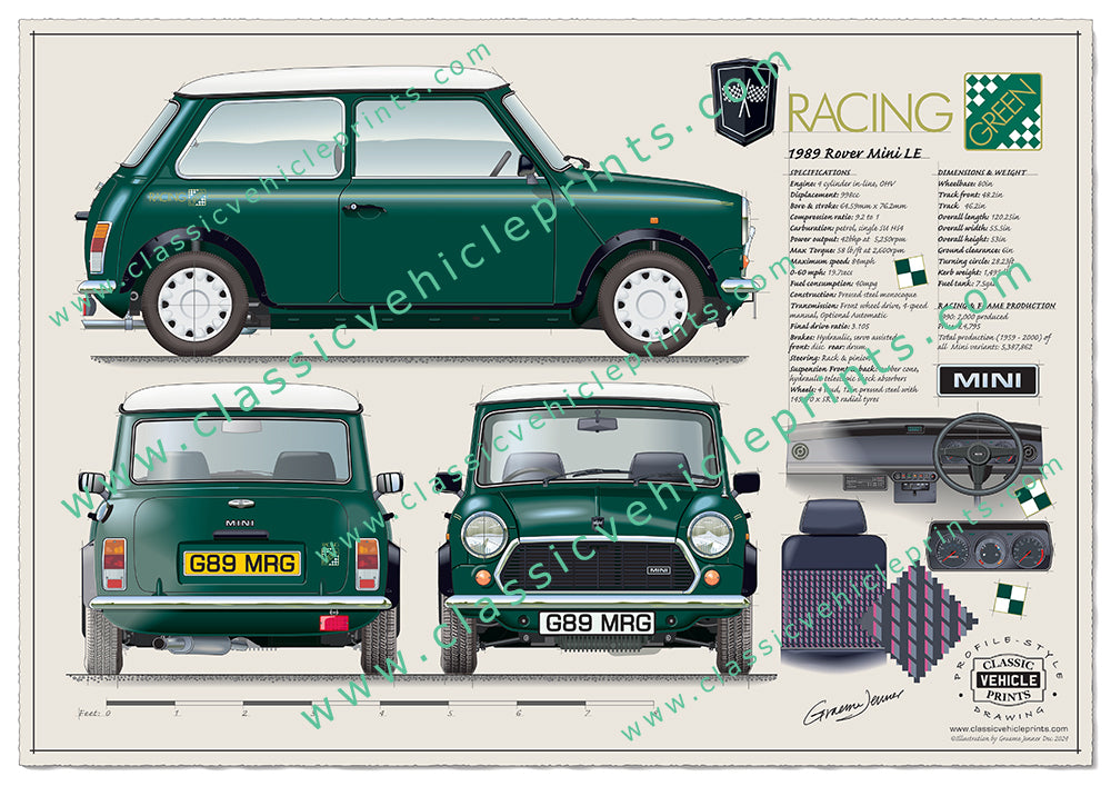 This illustration shows the 1989 Limited Edition Mini “Racing Green”. The car featured a 998cc engine, extended wheel arches, British Racing Green paintwork with contrasting white roof, and distinctive badging. In total, 2,000 cars were produced.