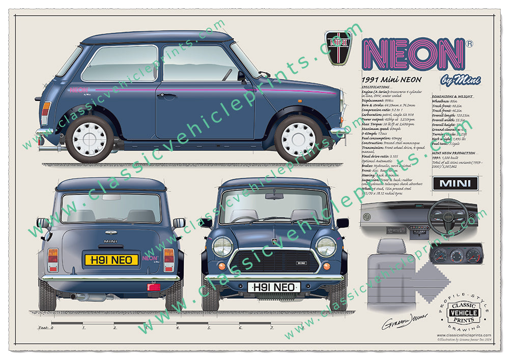This illustration shows the 1991 Special Edition Mini “Neon”. The car featured a 998cc engine, extended wheel arches and distinctive graphics and upholstery. 1,500 units were produced.