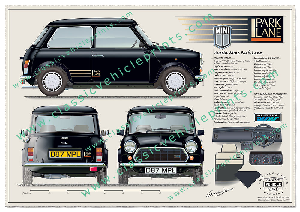 This illustration shows the 1987 Limited Edition Mini “Park Lane”. The car featured a 998cc engine, extended wheel arches, and distinctive graphics and upholstery. In total, 4,000 units were produced of which 700 were exported to Japan.