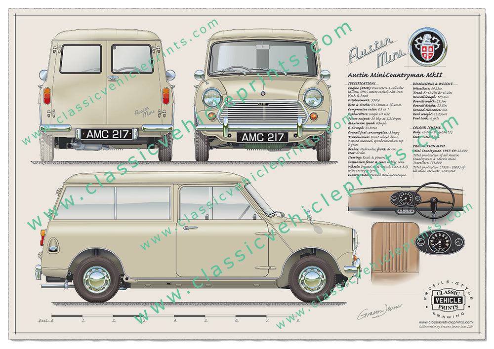 Originally badged as the Austin Seven Countryman, the Seven was dropped in 1962 with the car becoming simply the Austin Mini Countryman. Our illustration shows the model that was sold between 1967 to 1969. This model received a number of modifications including the 998cc engine rather than the older 848cc which improved performance, but the model was officially discontinued in 1969.