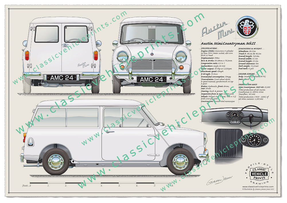 Originally badged as the Austin Seven Countryman, the Seven was dropped in 1962 with the car becoming simply the Austin Mini Countryman. Our illustration shows the model that was sold between 1967 to 1969. This model received a number of modifications including the 998cc engine rather than the older 848cc which improved performance, but the model was officially discontinued in 1969.