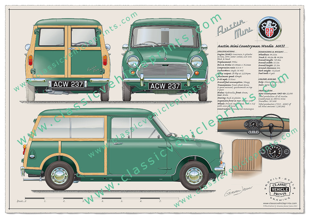 Originally badged as the Austin Seven Countryman, the Seven was dropped in 1962 with the car becoming simply the Austin Mini Countryman. Our illustration shows the model that was sold between 1967 to 1969. This model received a number of modifications including the 998cc engine rather than the older 848cc which improved performance but the model was officially discontinued in 1969. Whilst the standard model was finished in plain steel, the “Woodie” featured in our illustration was also available. The “woodie” was, as the name suggests, finished with wood detailing similar to the classic Morris Minor Traveller.