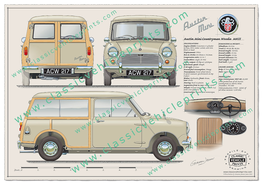 Originally badged as the Austin Seven Countryman, the Seven was dropped in 1962 with the car becoming simply the Austin Mini Countryman. Our illustration shows the model that was sold between 1967 to 1969. This model received a number of modifications including the 998cc engine rather than the older 848cc which improved performance but the model was officially discontinued in 1969. Whilst the standard model was finished in plain steel, the “Woodie” featured in our illustration was also available. The “woodie” was, as the name suggests, finished with wood detailing similar to the classic Morris Minor Traveller.