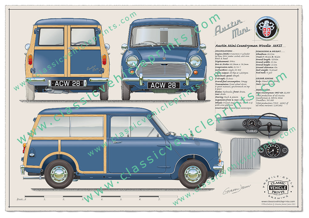 Originally badged as the Austin Seven Countryman, the Seven was dropped in 1962 with the car becoming simply the Austin Mini Countryman. Our illustration shows the model that was sold between 1967 to 1969. This model received a number of modifications including the 998cc engine rather than the older 848cc which improved performance but the model was officially discontinued in 1969. Whilst the standard model was finished in plain steel, the “Woodie” featured in our illustration was also available. The “woodie” was, as the name suggests, finished with wood detailing similar to the classic Morris Minor Traveller.