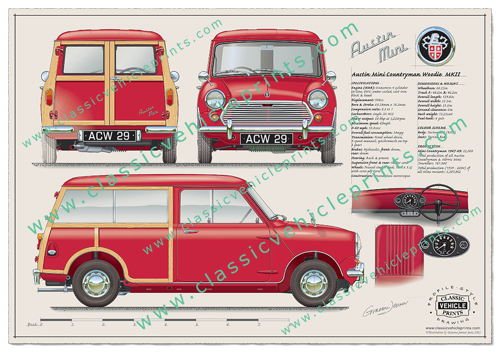 Originally badged as the Austin Seven Countryman, the Seven was dropped in 1962 with the car becoming simply the Austin Mini Countryman. Our illustration shows the model that was sold between 1967 to 1969. This model received a number of modifications including the 998cc engine rather than the older 848cc which improved performance but the model was officially discontinued in 1969. Whilst the standard model was finished in plain steel, the “Woodie” featured in our illustration was also available. The “woodie” was, as the name suggests, finished with wood detailing similar to the classic Morris Minor Traveller.