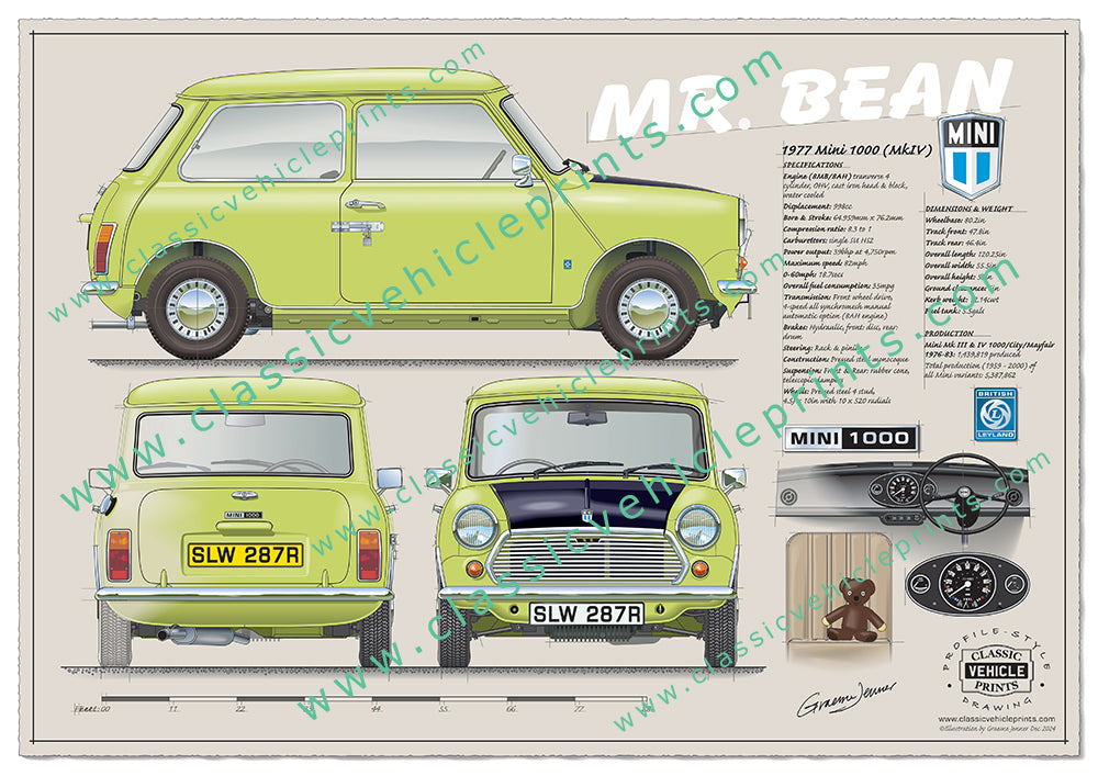 This illustration shows one of the most famous minis ever as it was featured in the popular TV series starriung Rowan Atkinson as Mr Bean. Based on a 1977 Mk IV mini, the car features additional security using a hasp and padlock, together with a black bonnet.