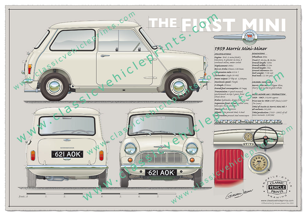 This illustration shows the very first production mini – the morris mini-minor. The car featured an 848cc engine and sliding windows.